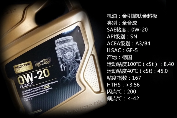 金引擎钛金超级0W20全合成润滑油,通过优质的全合成基础油(PAO)和顶级添加剂的科学调和,确保较薄的油膜具有超强的油膜强度,其高温高剪切粘度(HTHS)=3.56,保证了发动机在高温高转速运转时得到机油稳定的高温保护,可最大程度的减少摩擦损失,增加发动机功率,有效的提高燃油效率。满足路虎、捷豹、克莱斯勒、JEEP、福特、斯巴鲁、丰田等精密发动机要求用20粘度的车辆使用。