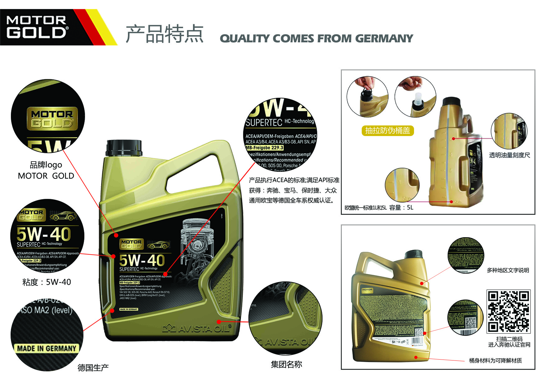 进口机油厂家金引擎在德国行业标准高,德国所执行的行业标准为ACEA(欧洲汽车制造商协会)远远高于中国所执行的API(美国石油协会),仅满足API标准的产品在德国是不允许销售的。包装要求高,桶的材料是环保可降解,即在特定的条件是可自然降解,外观体现为软塑。桶贴印刷技术独特,及背面桶贴是双层的可翻页的,有十几种语言。桶盖设计为拉伸盖在加油的时候起到引流作用。