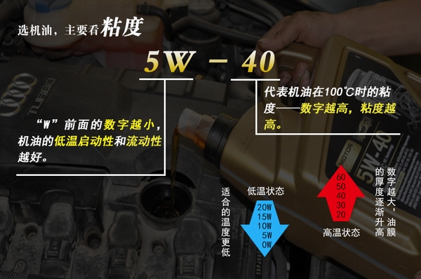 行车保养手册上面厂家已经注明机油的粘度标号,车主应该根据厂家要求的粘度选用机油,“W”右边的数字,那是发动机工作时需要的粘度等级,应该按规定选择。当然了,行驶里程已较长的发动机,由于磨损较大,为了加强密封性,可适当提高机油粘度。