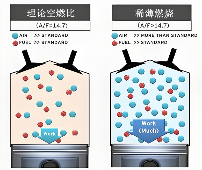 稀薄燃烧更高的空燃比下,发动机尾气的“残碳”少了,可是氮氧化物排放却高了。这可用更大的三元催化器、更高的催化温度来解决。然而,目前的稀薄燃烧技术主要是通过歧管喷射和缸内直喷来实现的。可就实际效果而言,“缸内直喷”是最好的。