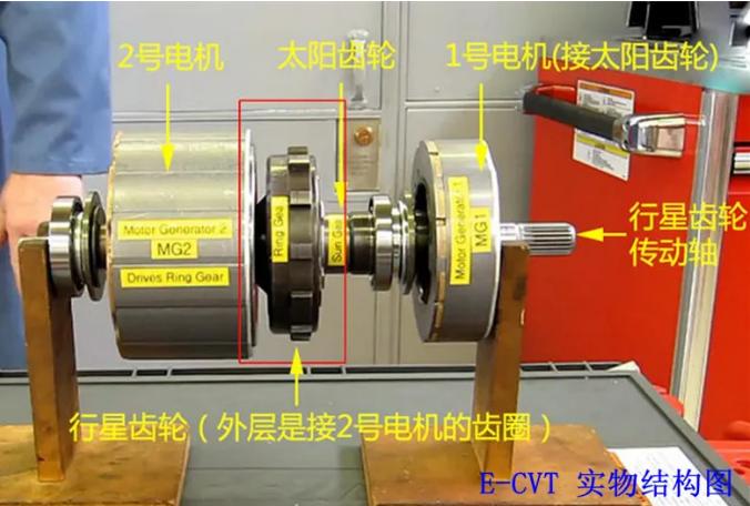 比如丰田的E-CVT,发动机与行星齿轮组的外齿圈相连,当发动机转动时行星齿轮与太阳轮和外齿圈咬合并推动二者向同一方向旋转。通过对太阳轮以及外齿圈的设计,将72%的扭矩分配给了外齿圈,把28%的扭矩传给太阳轮。