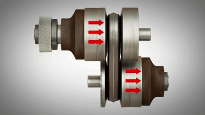 而CVT变速箱锥形轮对钢带的夹紧力度是会改变的,传递扭矩小的时候需要的摩擦力小,夹紧力就小。传递扭矩大的时候需要的摩擦力大,夹紧力就大。由于锥形轮表面是倾斜的,所以在夹紧钢带的时候钢带必然会有向外滑脱的趋势,这时候钢带内部的柔性环会固定住钢带,但同时柔性环也会被拉伸,传递的扭矩越大柔性环受到的拉力越大。