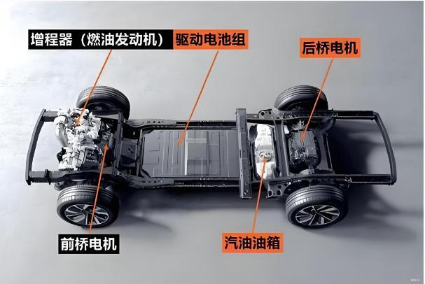 普通电动车+汽油发电机,汽油发电机也叫增程器,它不直接驱动车辆,而是像个充电宝一样为电池充电。在电池电量不足时,增程器启动为电池充电,从而保证车辆始终以最经济的模式行驶。