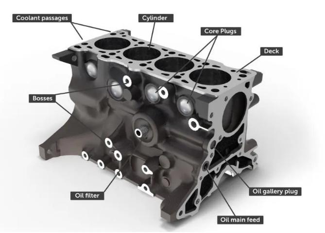 另外,在气缸体内部,有着纵横交错的水道和油道,有各种座孔、隔板等,并形成大量的空腔,用来储存冷却液和机油。为了给曲轴、凸轮轴等轴承润滑,为了给活塞喷油散热,在这些部位还有分油道和机油喷嘴,引导机油的流向,保证发动机润滑系统循环正常。此外,还有引导水流方向的水道、各种阀体、工艺孔等。