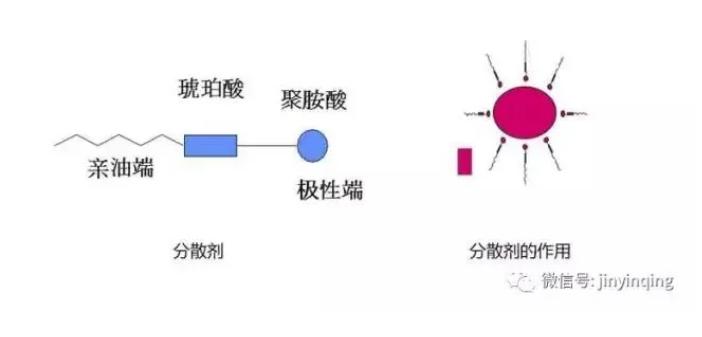 清净分散剂都是一些表面活性剂,它能将本来在油中不能溶解的固体或液体物质增溶于由5-20个表面活性剂分子集合而成的胶束中心,在使用过程中,它将含有羟基、羰基、羧基的含氧化合物、含有硝基化合物、水分等,增溶到胶束中,形成胶体,防止进一步氧化与缩合,减少在发动机部件上有害沉积物的形成与聚集。