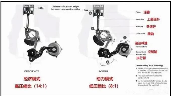 进口润滑油|利用杠杆原理,在偏心轴转动的时候会连带着控制杆上下运动,因为杠杆的作用,连杆会向偏心轴的反方向运动,这样就会改变压缩上止点活塞的位置,从而改变压缩比。