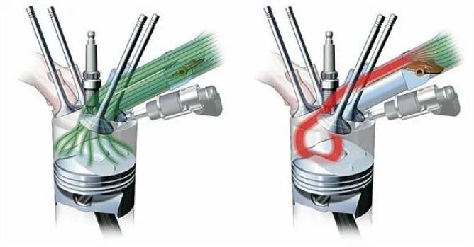 第二种方式,利用燃烧室独特设计的壁面结构,令混合气产生滚流,进而产生浓度差异;通过可变进气技术,在发动机低速运转时,对部分进气道实施截流,以增大进气涡流强度,促使混合气实现分层。