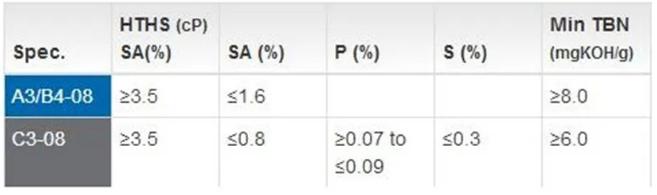 C3标准则是为催化式发动机润滑油而打造,特别适用于那些装备了DPF(颗粒捕集器)的柴油车型。同时满足低/中SAPS(硫、磷、灰分)的要求,高温剪切值不得低于3.5。