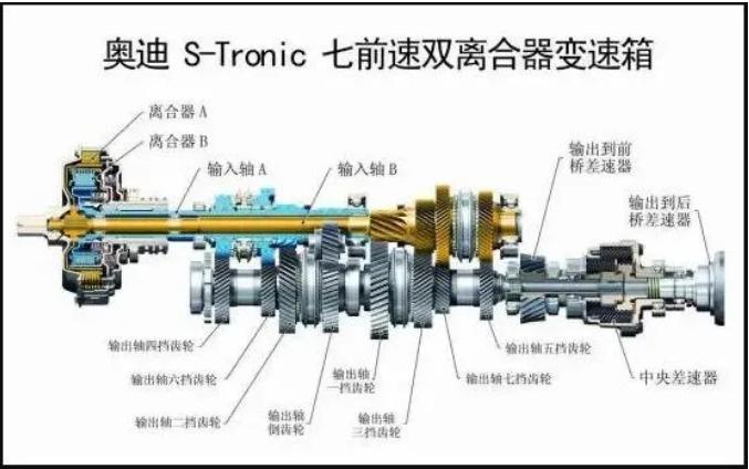 进口润滑油|双离合依靠齿轮啮合产生挡位,一个挡位就需要两组齿轮配合构成,不像AT变速箱可以靠行星齿轮,组合出多个挡位。齿轮组的增加势必会增加变速箱的尺寸和重量,多车辆的空间需求就会变大。像奥迪S-tronic双离合变速器有7个档位,在轴上就能找到7组齿轮。所以变速器整体显得很细长,体积大。