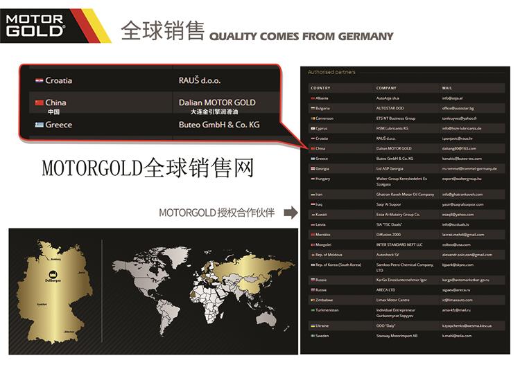 有着9年市场销售经验的金引擎机油,属于德国原装进口的一款产品,在德国生产,同时在德国同步销售,确保我们市场见到的如同德国本土是一致的,同时金引擎机油销往30多个国家和地区,亚洲包括中国与韩国。