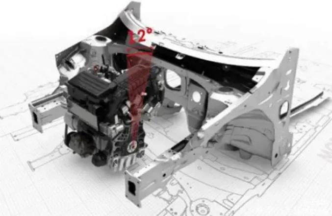 这种布置形式,两侧的半轴是不等长的,并且与变速箱的夹角也不相等。这样就会出现一种特殊的现象:“扭力转向”。汽车在起步或者急加速时,由于两侧的车轮受力不均等,会自动地向一侧偏转,有一定的危险性。而发动机倾斜布置,目的是让左右半轴与变速箱之间的夹角相等,降低扭力转向的趋势。这种布置,在大众车上比较常见,一般发动机的横向倾角在3到5度之间。