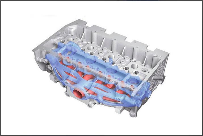 集成缸盖,全称为“内置式气缸盖排气歧管技术”。是在原本就已经十分复杂的气缸盖中再加入排气歧管,而本身紧凑的气缸盖内构件就已经很多,所以这项技术考验的是厂商的结构布置、力学设计、材料应用以及更为精尖的机件加工能力。