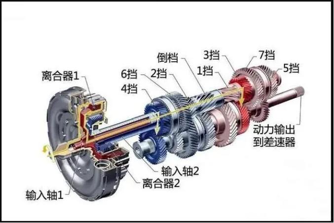 双离合变速箱的基础理论其实就是手动变速箱,二者的传动结构均采用平行轴式齿轮机构。这种齿轮机构的优势在于可获得更高的传动效率。但劣势是定轴式齿轮机构的一组或一排齿轮只能实现一个挡位。想增加更多的挡位,就需要在轴上添加更多的齿轮组数。