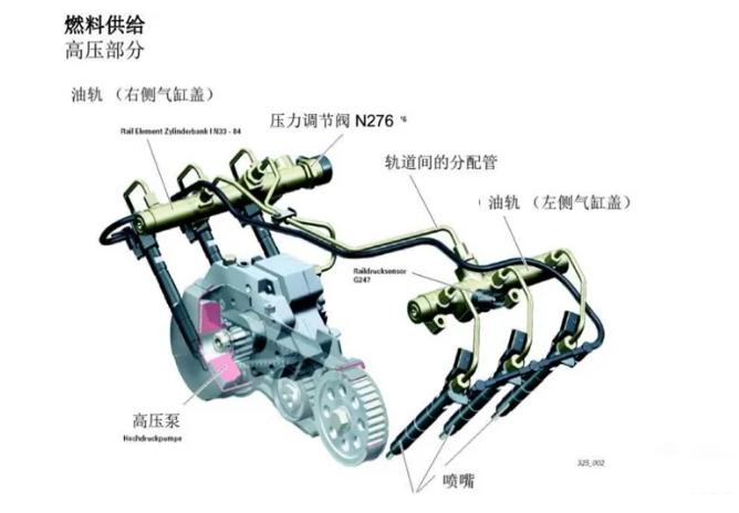 二代TDI发动机采用共轨燃油喷射技术,与泵喷嘴技术相比,共轨燃油喷射技术是由电脑控制的燃油喷射系统。该系统燃油由电子泵进入油轨之后,再分配到各气缸中。这种设计不但可以达到更好的喷油精度和压力控制效果,还可以提高引擎的动力性,降低油耗与排放。由于取消了由凸轮轴驱动的活塞泵结构,在噪音方面也取得了新的突破,第二代奥迪TDI发动机运行噪音已经接近汽油机水平。