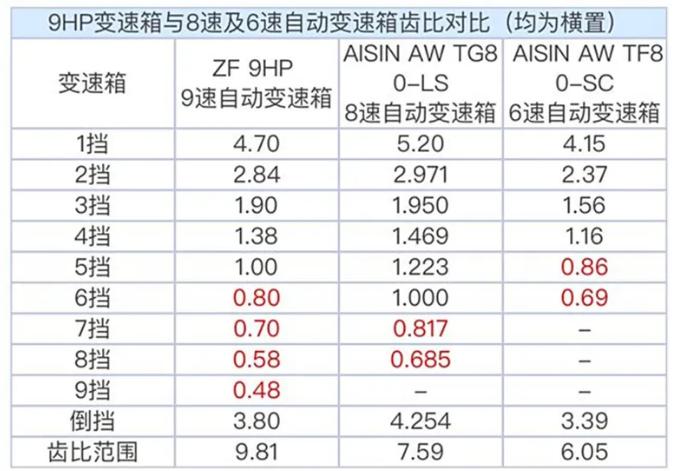 变速箱的差异主要指的是传动比范围的不同。传动比范围=最低挡位齿轮比/最高挡位齿轮比,这个数值越大,越能保证车辆在高速巡航时获得更低的发动机转速。比如拿一款传动比范围:4.3/0.7=6.1的6速手动变速箱和一款传动比范围是4.7/0.48=9.8的9速AT变速箱9速做对比,可以看到,9速的传动比6速的高了接近40%。好处就在于保持车辆巡航时9速变速箱的发动机转速会压得更低。所以高速巡航的多挡位变速箱车辆发动机转速是要比少挡位发动机要低的。