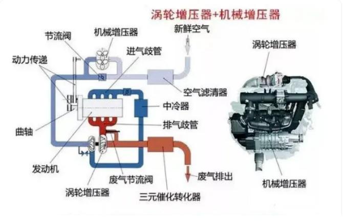 而机械增压与涡轮增压的优缺点正好相反,所以,汽车工程师开发出了涡轮增压器+机械增压器的混合式双增压发动机,形成优势互补。在低速时机械增压器起主要作用,在中高速时涡轮增压器起主要作用,涡轮迟滞现象基本杜绝,从而保证发动机在低速、中速和高速时都能有较好的性能。