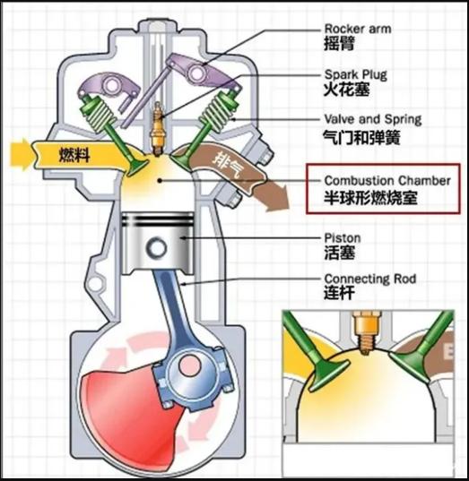 另外,现在的汽油引擎基本上是半球形燃烧室,半球形燃烧室的特点是:换气充足、火焰行程短、抗爆性强,能提供良好的燃油经济性与动力性。不过这种发动机的气门需要呈横向V形布置在气缸盖上,气门的尾部相距较远。这种结构最合理的驱动方式就是使用两个凸轮轴分别控制进气门和排气门的开启与关闭,因此双顶置凸轮轴得到了广泛应用。