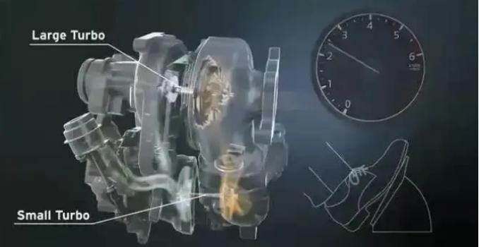 而后劲不足的解决方案就是“二级涡轮增压”,即依然采用“低惯量”涡轮,在低转速时低惯量涡轮会先介入,保证中低转速拥有充足的扭矩。再增加大惯量涡轮或者“机械增压器”,当转速达到一定值,大惯量涡轮的旁通阀会开启,让废气同时带动两颗涡轮,并且由于采用串联结构,可以实现增压叠加的效果,满足发动机高转速工况的要求。