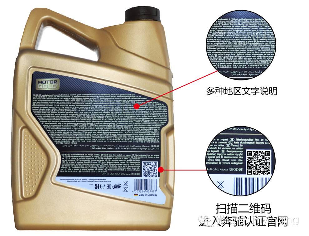 金引擎润滑油包装桶材料是软塑并且环保可降解的。桶贴背面是双层的可翻页的,翻译成二十几种语言。桶盖设计为拉伸盖,在加油的时候起到引流作用,桶体侧面有透明刻度尺,让您清晰可见油的用量,当您拿出手机扫描产品背贴上的二维码即可进入奔驰认证官网。