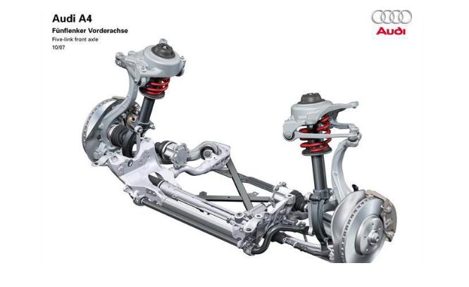 大众横置平台的车型采用前悬挂为麦弗逊悬挂,只有一根下摆臂,搭配转向拉杆。而奥迪纵置平台车型采用的是前后5连杆,五连杆的优势在于它能够提供更好的支撑性,尤其是急速过弯时对侧倾感的抑制效果更加出色。